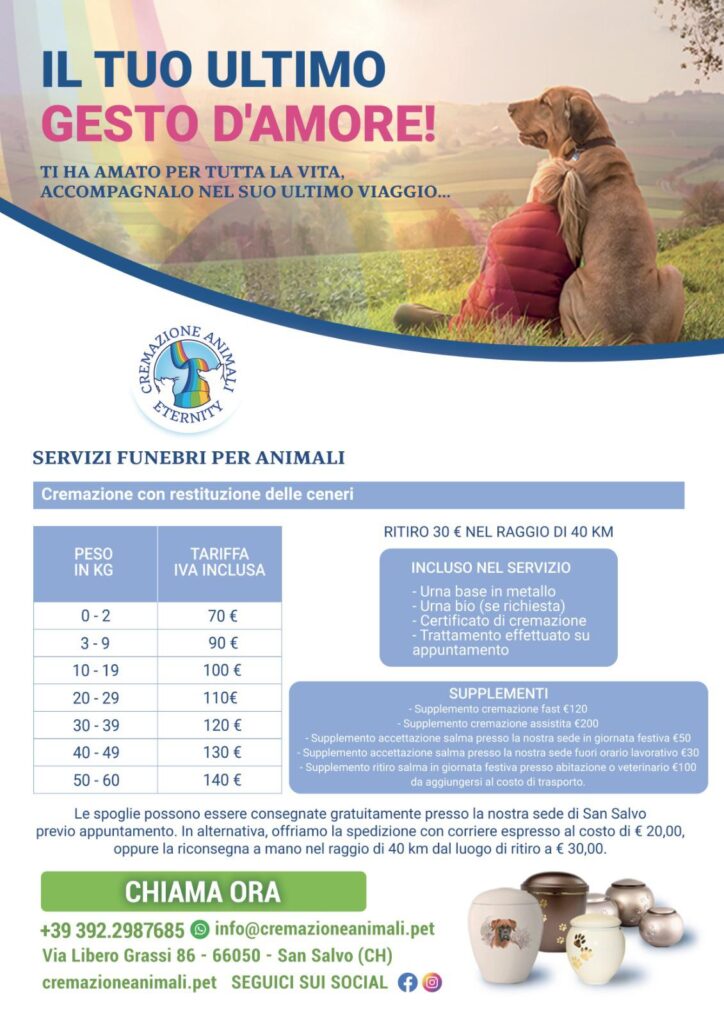 In Abruzzo e Molise, sempre più famiglie scelgono la cremazione come ultimo gesto di amore e rispetto verso il proprio amico a quattro zampe. La possibilità di ricevere le ceneri in un’urna personalizzata permette di avere un ricordo concreto, un legame che continua anche dopo la perdita, casomai da collocare in un luogo speciale, quello in cui il proprio amico amava riposare o giocare.